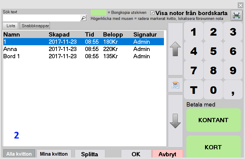 För att hämta upp kvittot, tryck på [P] och välj önskat kvitto. Tryck [OK].