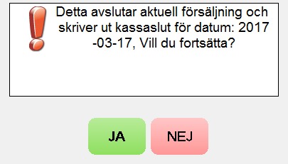 Tryck på knappen för att avsluta dag. Det kommer en ruta med en fråga om det är den aktuella dagen ni vill avsluta (se bild nedan). Tryck [JA]. Dagsavslut ”Klar” kommer som bekräftelse. Kassan kan vara inställd på att stängas ned efter avslut vilket då kommer ske automatiskt när allt är klart.