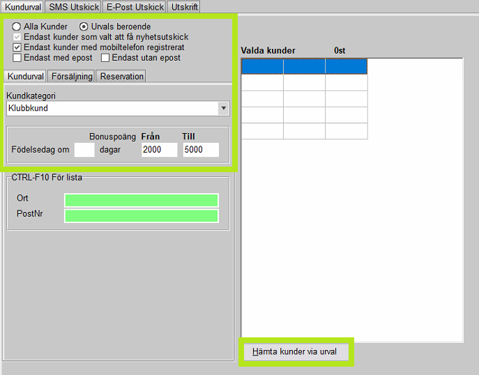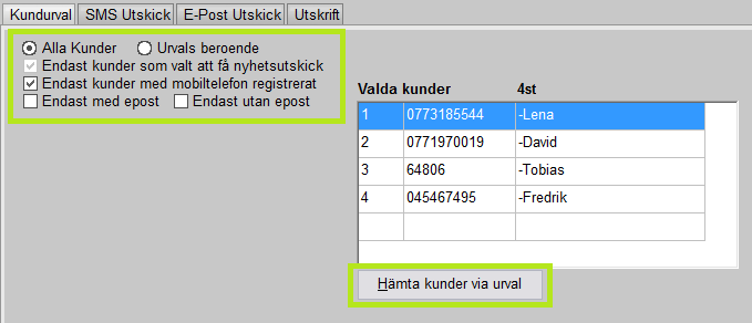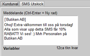 Andra fliken används för att skicka SMS till det urval som gjordes under fliken "Kundurval". SMS är ett mycket effektivt sätt att nå era kunders uppmärksamhet på. E-post har en tendens av att antingen inte läsas eller att hamna i skräphantering vilket SMS vanligtvis inte gör.