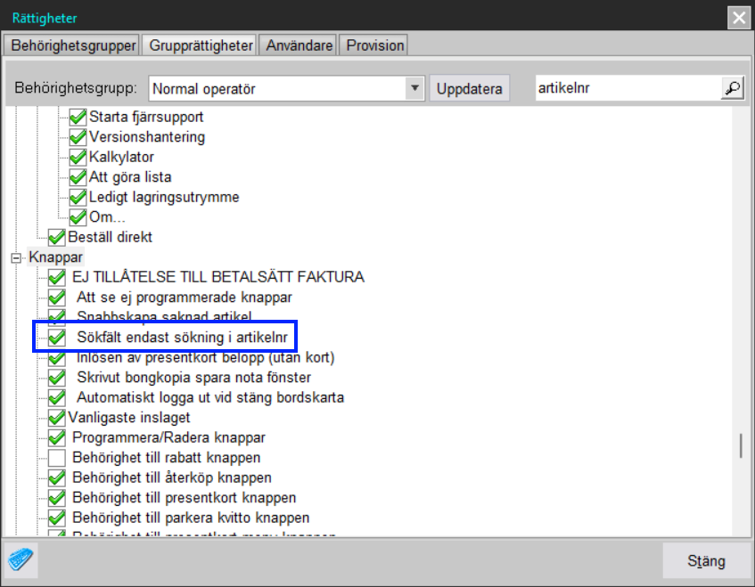 Om streckkoden inte fungerar i kassan utan man får upp att artikel saknas kan detta bero på en begränsning i behörighetsgruppen. Öppna flike Grupprättigheter och tillse att "Sökfält endast sökning i artikelnr" är markerad.
